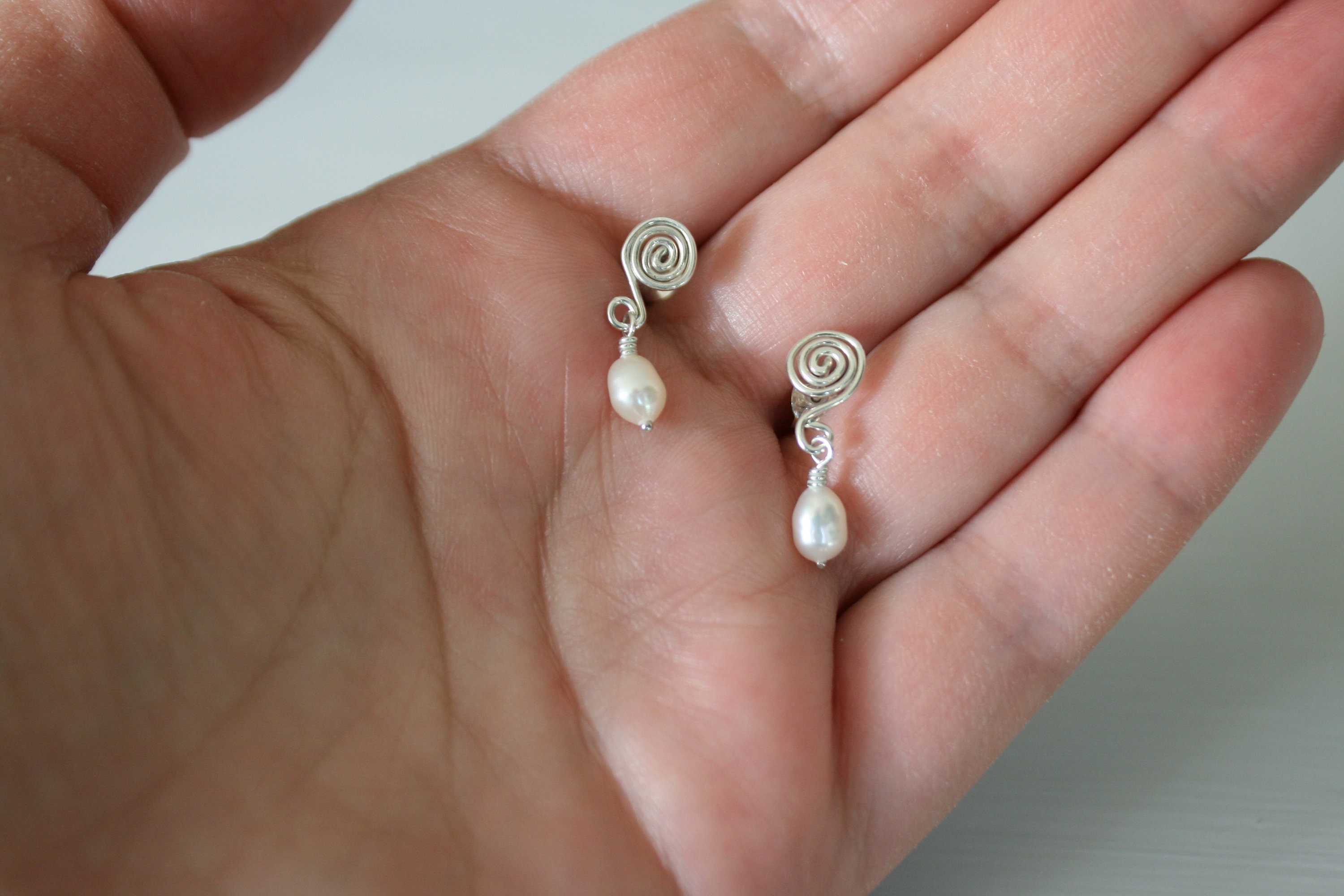 These studs are wonderfully unique and one of a kind, perfect for a wonderfully unique woman! They are handmade from freshwater pearls and sterling silver, and are sturdy enough for everyday wear.